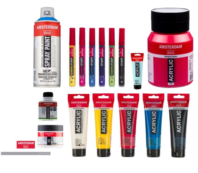 Amsterdam, en super god studieakryl, som vi fører i fuldt program(90 kulører) i 20ml og 120ml tuber samt 500ml bøtter. Vi fører også et udvalg af Amsterdam Spray.
